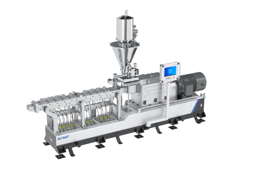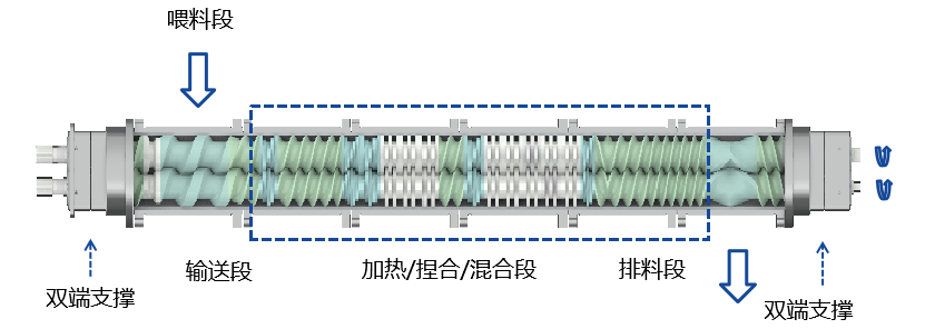 干法粉体处理系统负责完成从粉体原料到纤维化造粒的全流程,涵盖粉体上料、计量、混合与预纤维化、双螺杆纤维化、破碎过筛等环节。其核心创新在于自研的全陶瓷干法双螺杆纤维化设备: