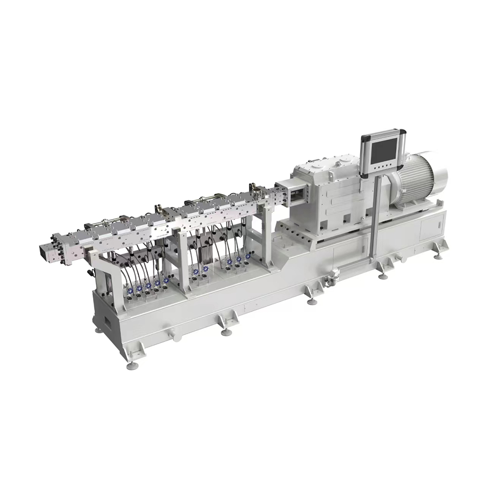 双螺杆挤出机主要用于集输送、加热、混炼、分散、混合、挤出等功能的加工设备。该设备为单阶双螺杆配置;主机机筒组件为上下剖分结构设计;便于检修与维护;单阶机由分散捏合主机、齿轮箱、驱动端等部件组成;通过电机驱动两个同向旋转的螺杆;两个螺杆以积木组合方式设置了各功能不同的螺纹元件。物料在同向双螺杆挤出机螺杆螺槽中输送、加热、被剪切、挤压;在双螺杆内腔狭缝中反复被剪切、混合揉搓纤维化后被挤出机模具挤出。